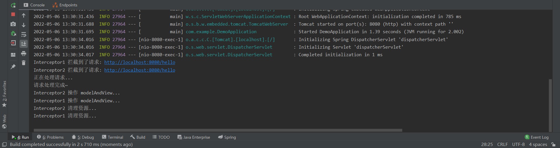 可以看到,Interceptor 成功拦截到了访问 Controller 的 /hello 请求和访问静态资源的 /favicon.ico 请求,并在请求处理前后执行了相应的处理逻辑。