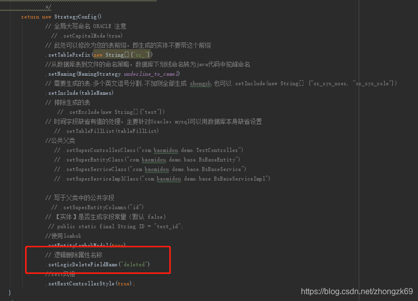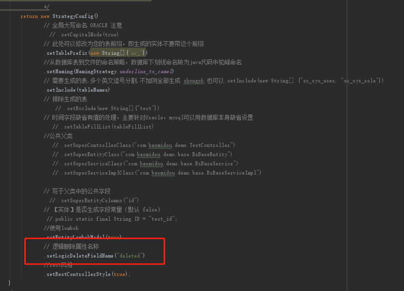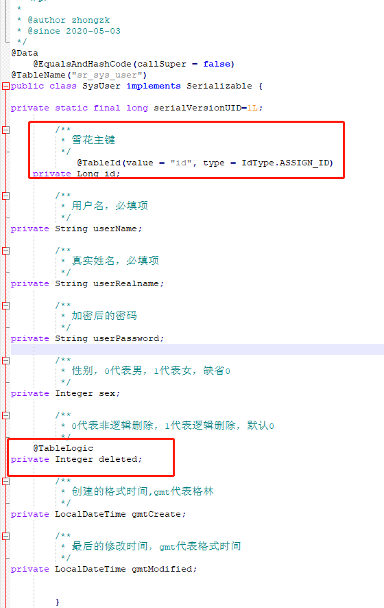 2. 逻辑删除字段,所有的表均有一个deleted(类型int)作为逻辑删除标识字段,为了在entity实体类中标注: