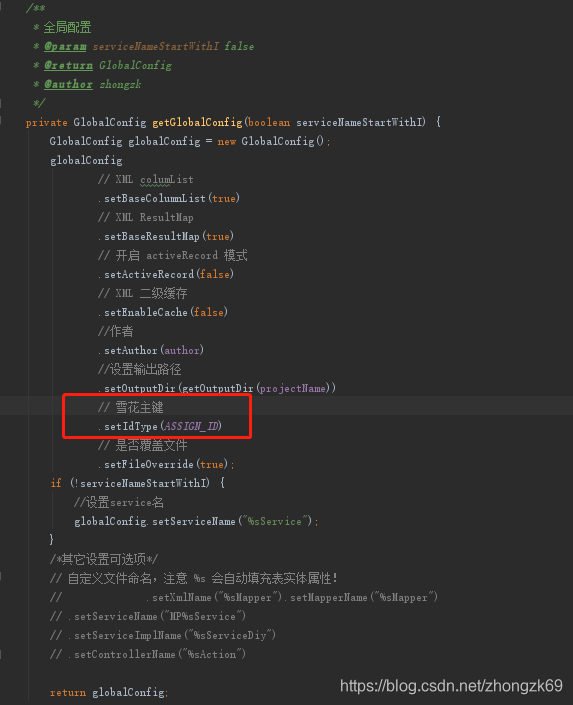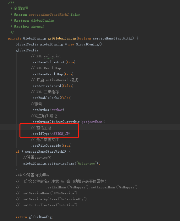 只好在上篇的MyBatisPlusGenerator代码中设置,为了entity生成雪花主键的注解,见如下图: