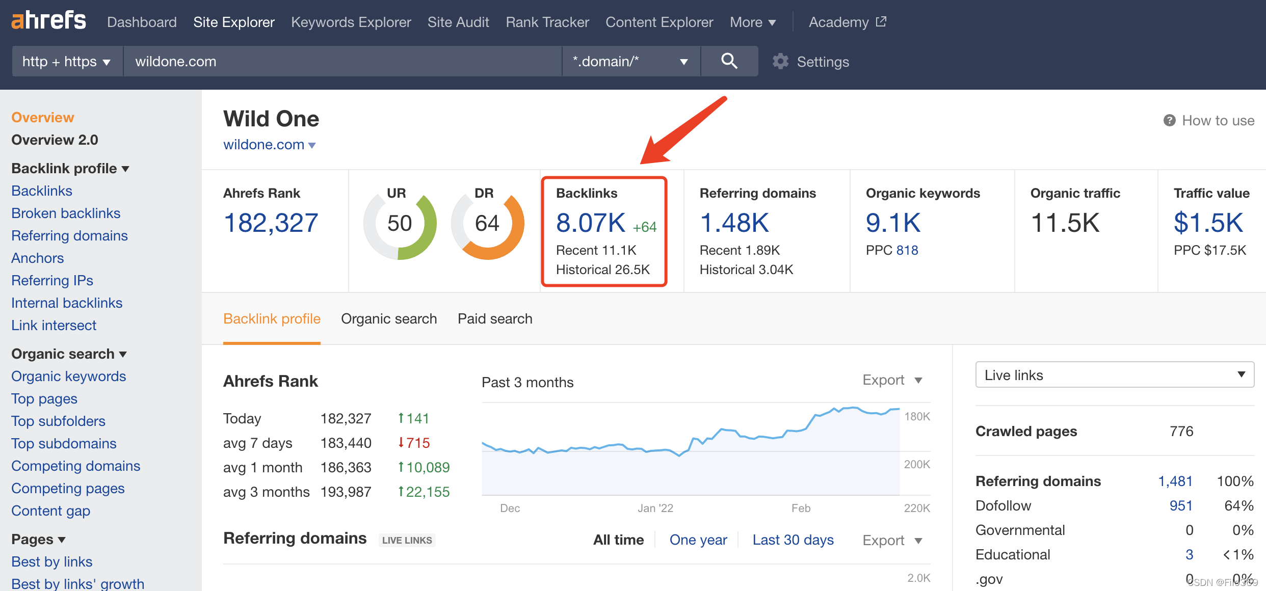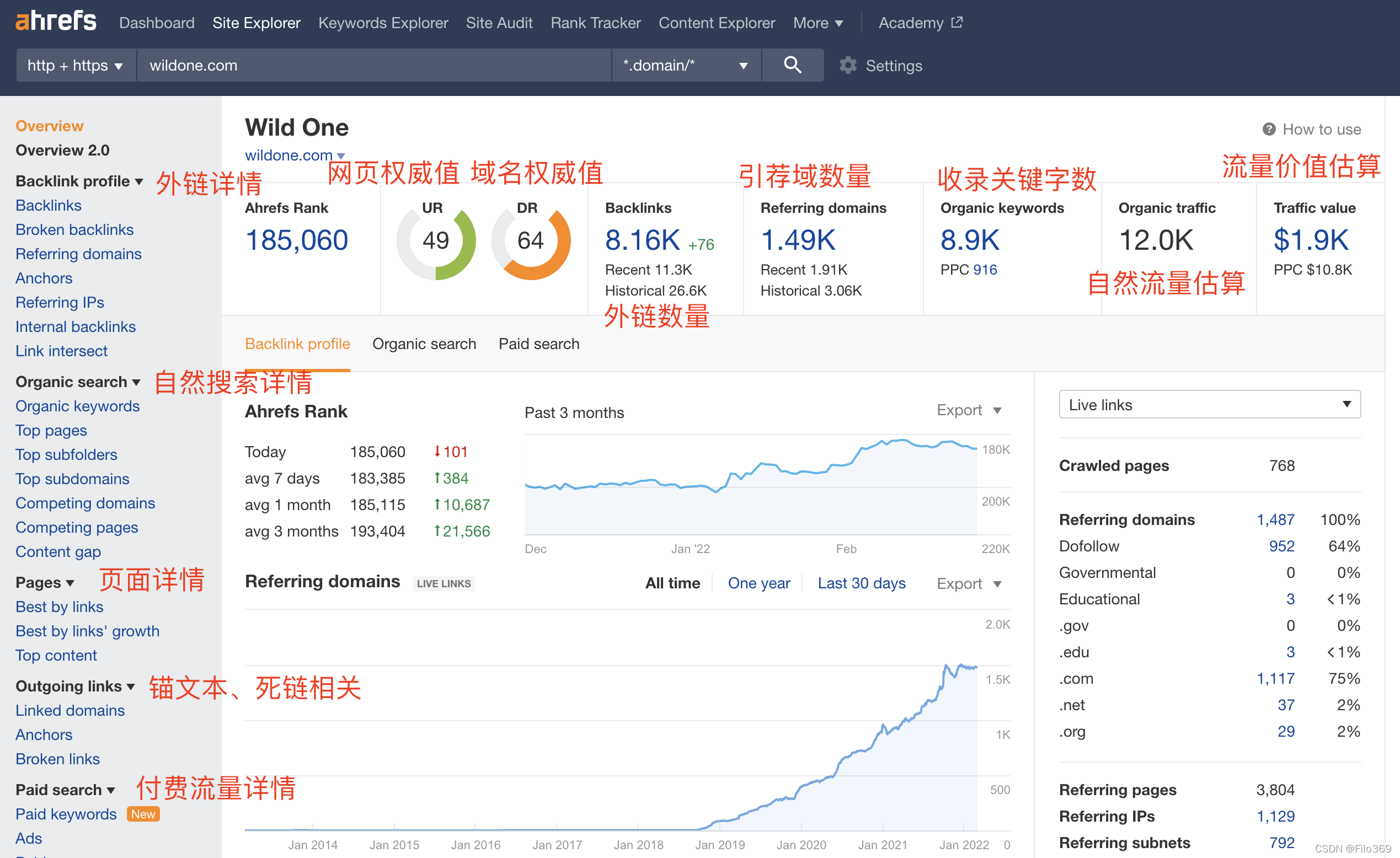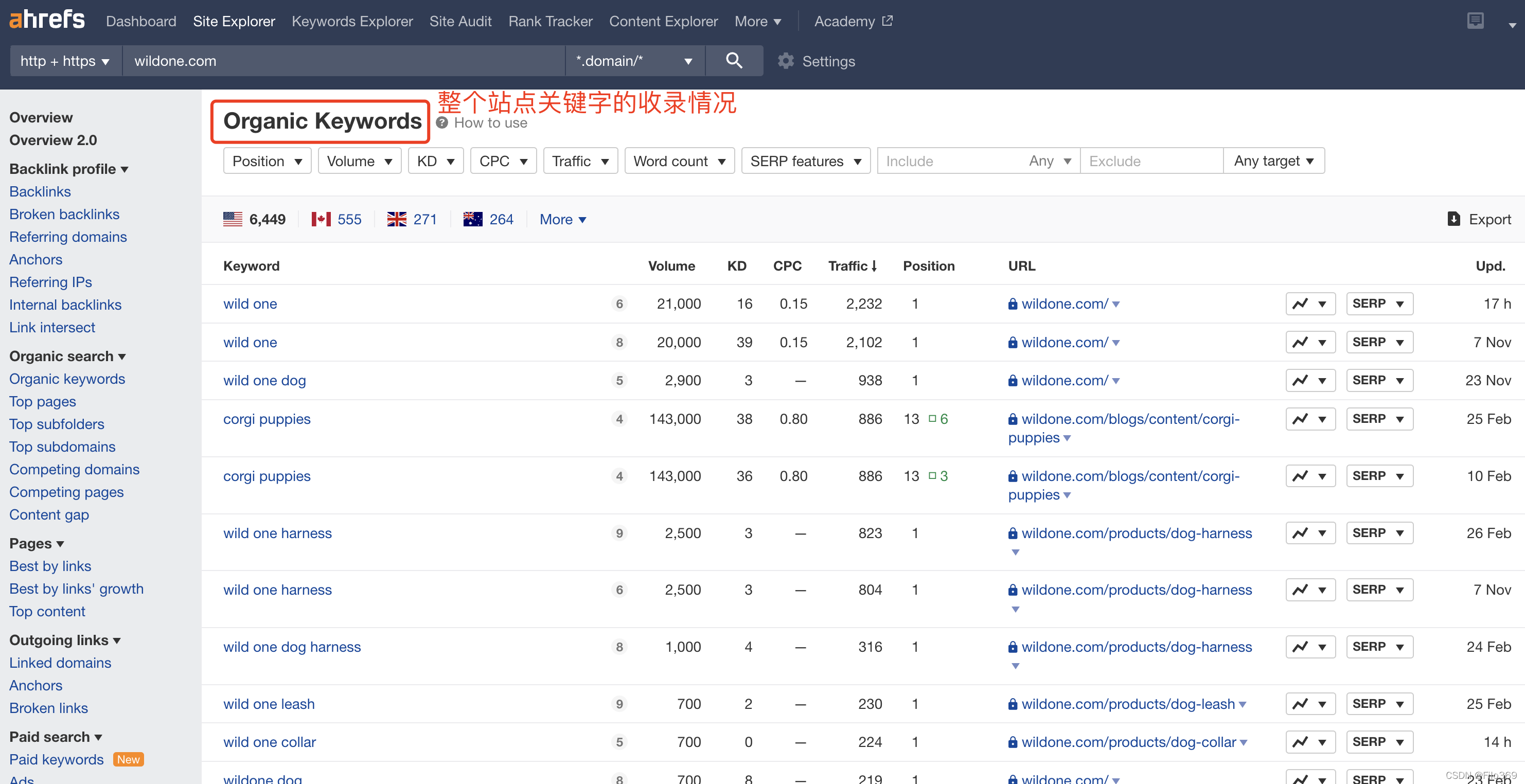 使用 Ahrefs 分析整个网站。用 “Site Explorer” 对整站,或者单个页面进行分析,如下所示,输入 ”wildone.com“ 域名,可以获取 Ahrefs 的整站数据评估概览。