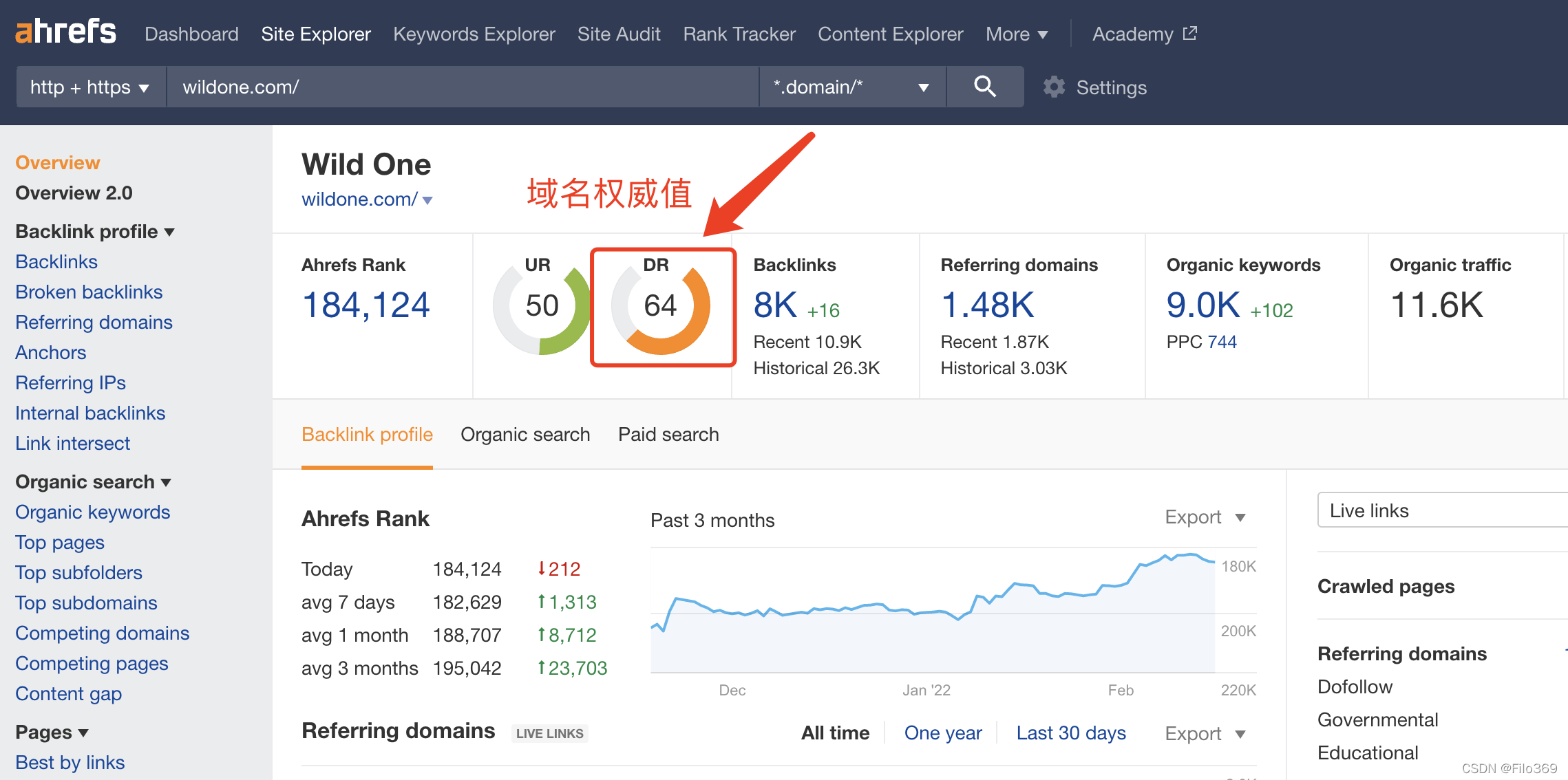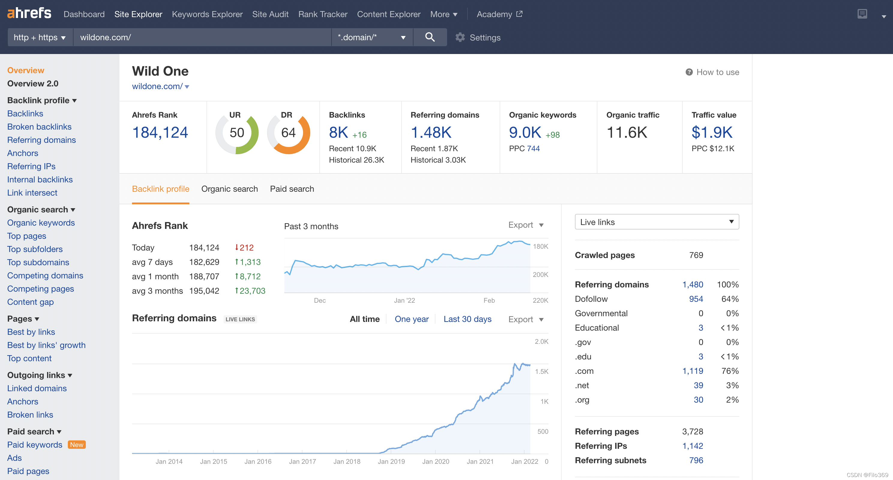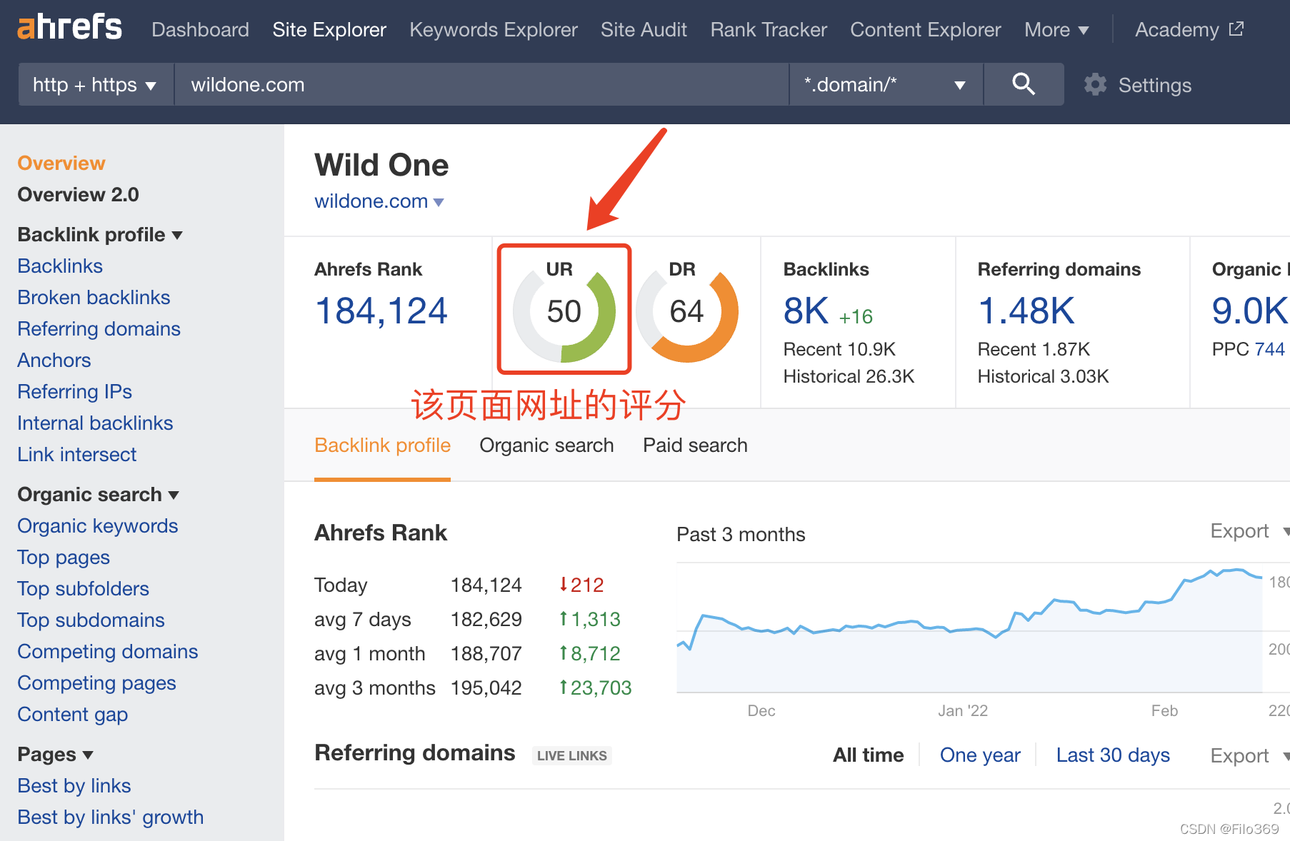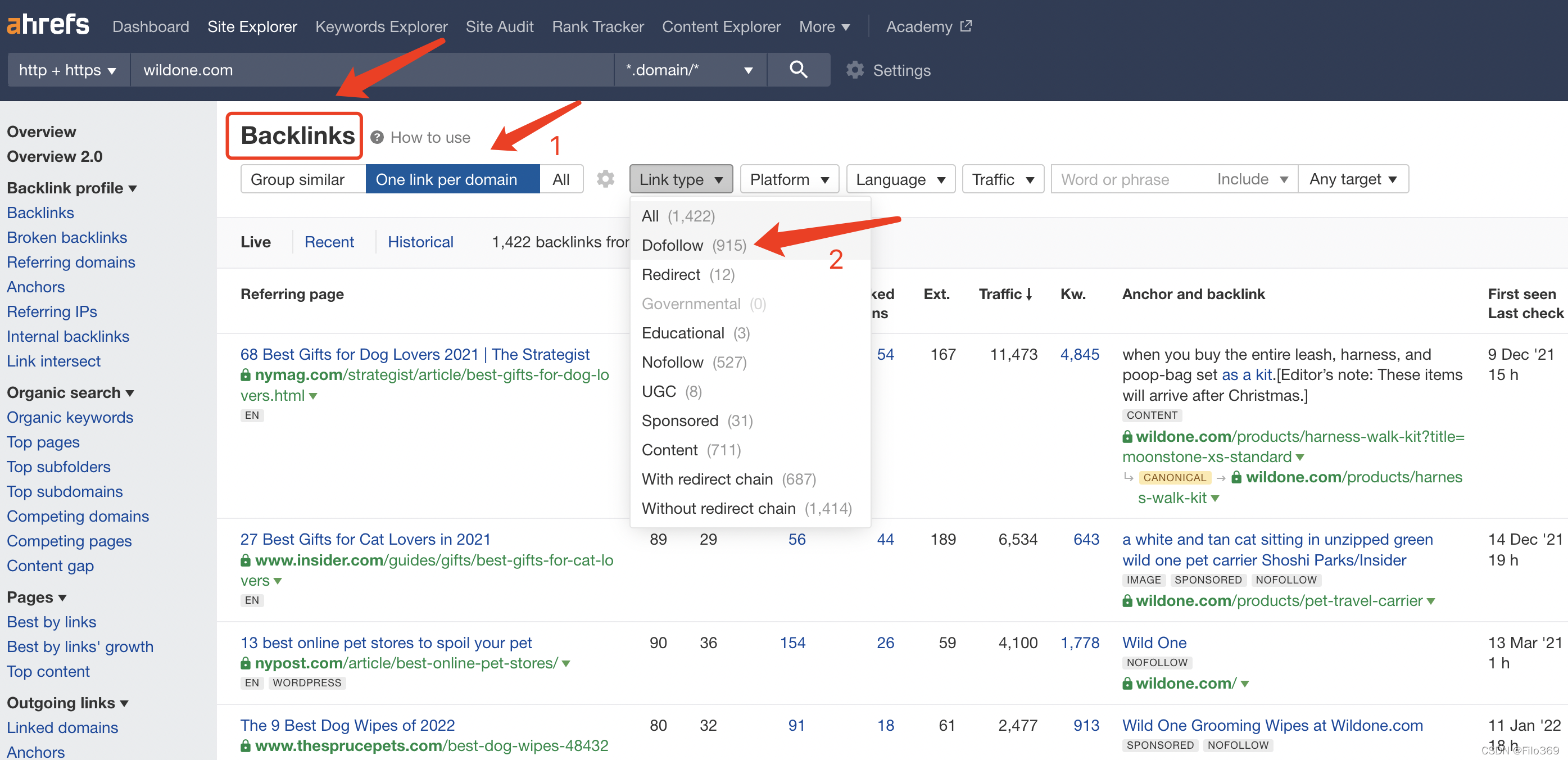 使用 Ahrefs 分析整个网站。用 “Site Explorer” 对整站,或者单个页面进行分析,如下所示,输入 ”wildone.com“ 域名,可以获取 Ahrefs 的整站数据评估概览。