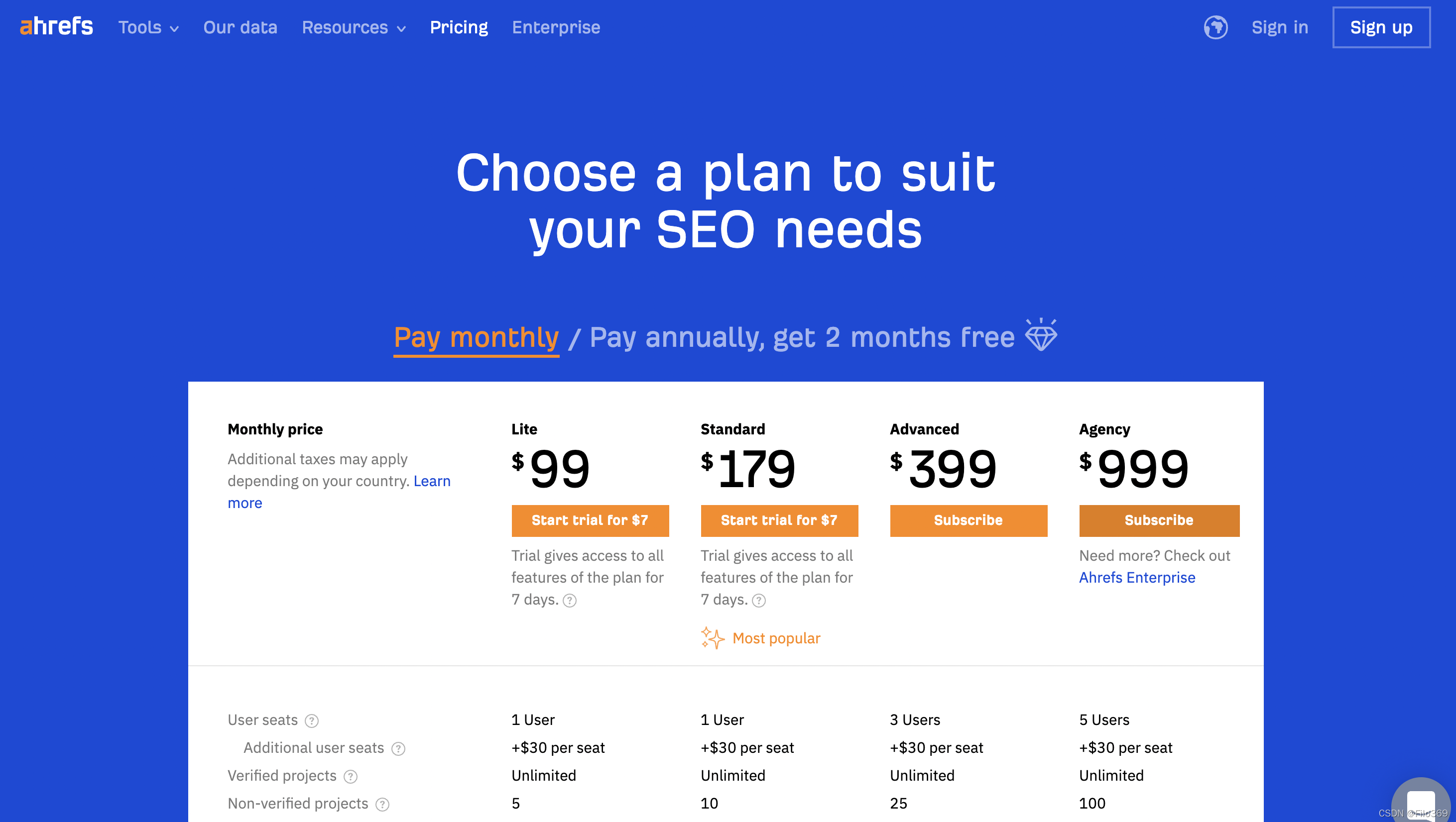 Ahrefs 在官网卖得比较贵,最低级的套餐要 $99,剩下的套餐依次是 $179,$399,$999,根据不同需求递增。