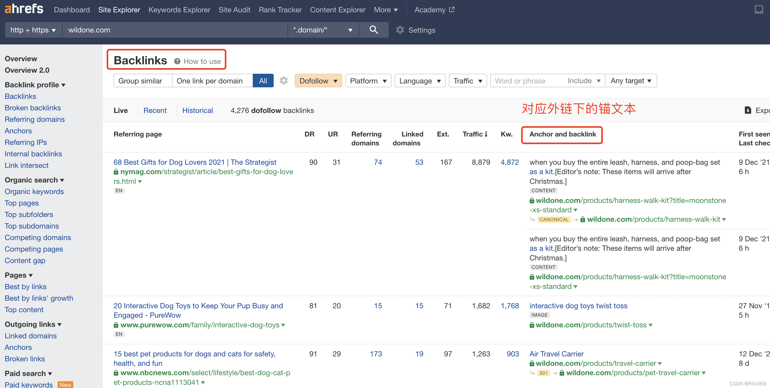 用 Ahrefs 查看竞争外链和外链上对应的锚文本 Anchor Text。通常输入竞争对手域名后,由 Ahrefs 的外链模块,可以顺藤摸瓜,查看哪些站点给了竞争对手外链,以及给外链的具体落地页上,用了哪些锚文本。