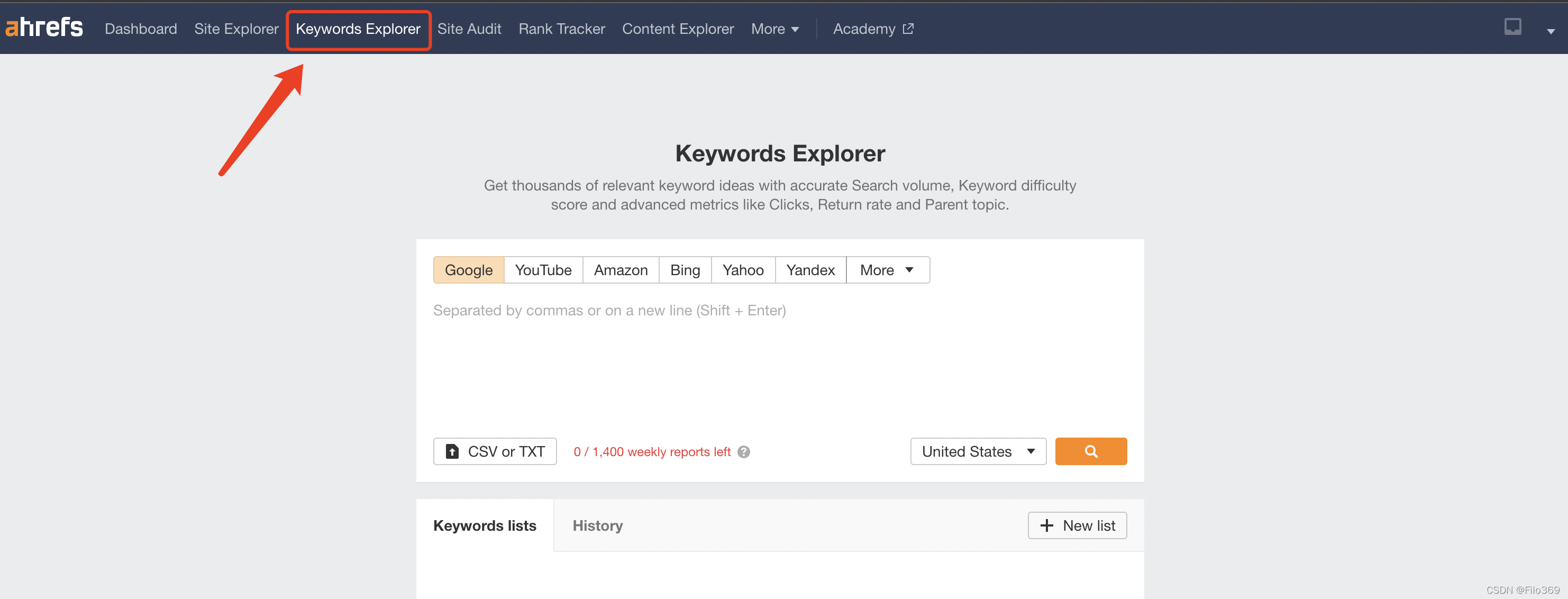 使用 “Keywords Explorer” 进行关键字调研,其中主要以 Google 为主,其他的 Youtube、Amazon、Bing、Yahoo、Yandex 等用得相对较少。