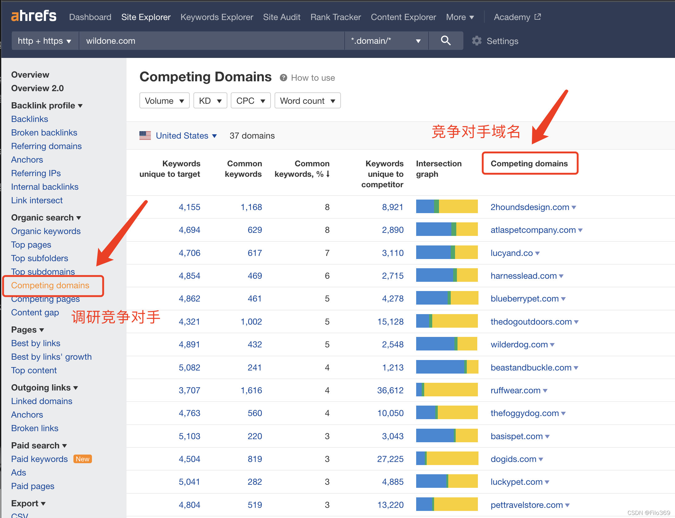 用 Ahrefs 查看主要竞争对手网站。在 Ahrefs ”Site Explorer“ 下的整体概览中,左侧 “Competing domains” 可以调研竞争对手的域名,如下所示: