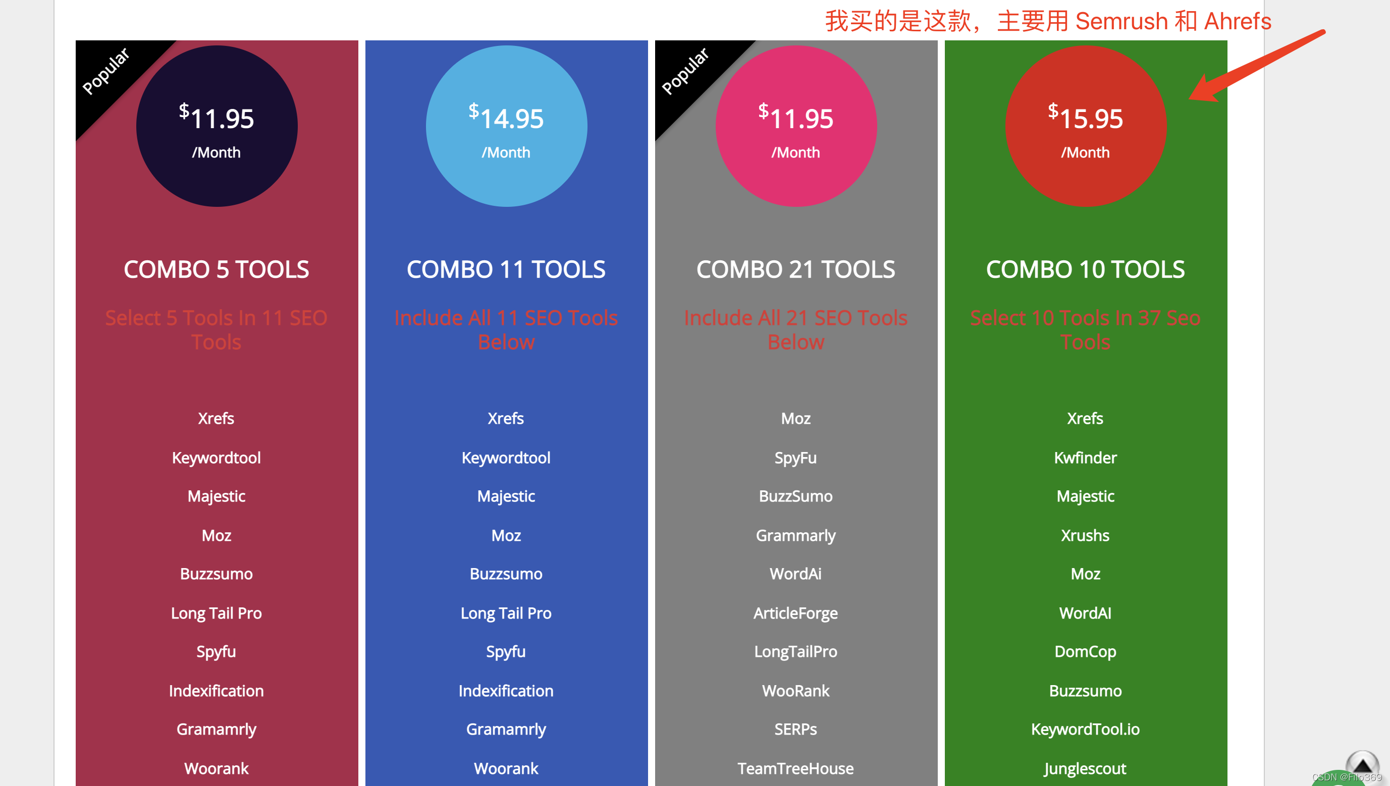 我自己用的是 Ahrefs 团购价格,之前在国内淘宝上买过,85 一个月,但是只能使用 Ahrefs 一个工具。目前在用的 Ahrefs 团购工具箱,是找国外老外买的,和其他 9 个 SEO 工具一起,总共每个月 100 元左右。
