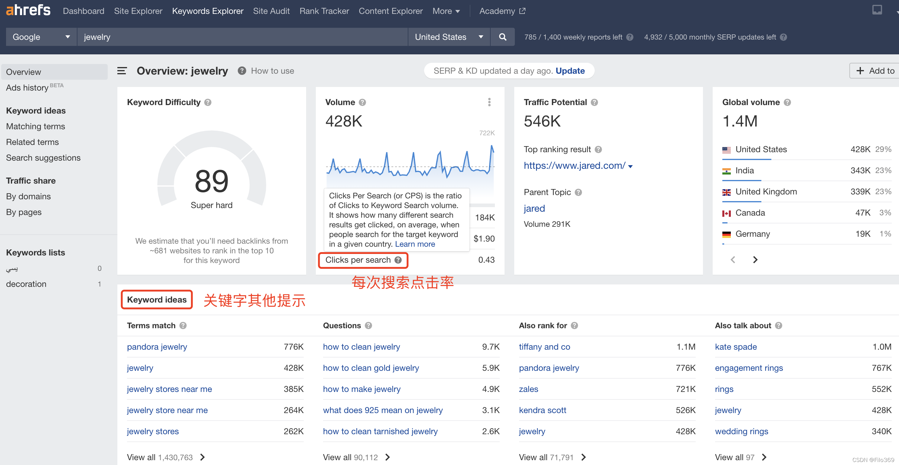其中可以通过查询域名,查看 Paid 和 Organic 的流量占比。下面的 CPS 则是每次搜索点击次数 Clicks Per Search。其中由 Keywords ideas 种子关键字变体,可以看自己是否漏掉没有想到的词,这一块通常用来长尾词分析;