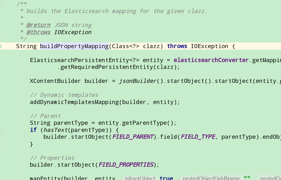 MappingBuilder这个类对@Field进行解析, 后来进去发现@Mapping解析.json,也就是网上的方法解析方法也在里面, 哈哈殊途同归, 对外提供的方法为: