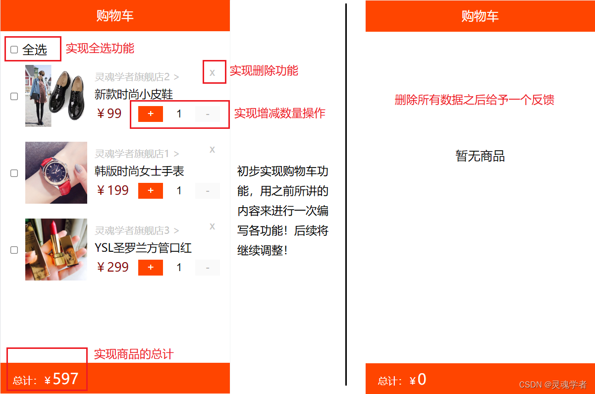 this.checkGroup = this.checkGroup.filter(goods=>goods.id!=del_id)以上就是这个购物车页面,用之前所讲的内容结合应用,后续将继续讲解新内容来进行修整案例!感谢大家的支持,如东西比较多,可以先理思路将页面编写下来,再进一步的的编写会比较好一些!