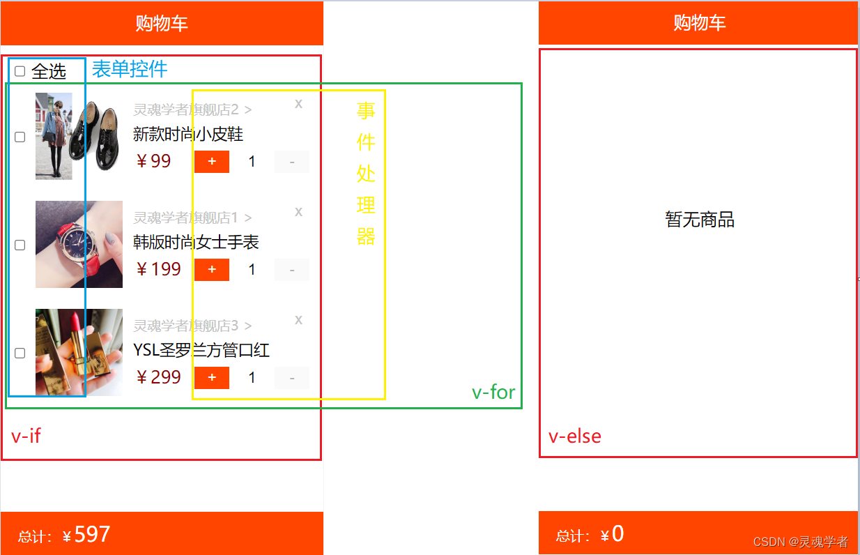 将上面的页面分析之后,对页面进行编写,如在data中模拟几条商品数据,通过v-for循环渲染到前台页面,渲染完对应的商品之后,接下来是做事件处理,商品的一个增减器,但这里需要注意一个问题商品数量是不能够减到负数的,而增值是不能大于它所持有的库存,那么这里我们仅考虑这些,实际上是不止的,是需要做用户操作反馈,比如已经达到库存值需要提醒用户等的一些操作,加减可以用最简单的方式来完成,删除也是,可以同splice函数来处理,但这里需要对checkGroup的删除进行id的删除而不是索引值,同时可以在data中定义一个是否全选的值,默认值是false以及一个勾选集合checkGroup,在对应的每个商品选项勾选中添加一个v-model绑定勾选集合,同时绑定一个value值是当前的商品信息,再添加勾选监听,每次勾选的时候判断checkGroup中的长度跟我们购物车当中的数据长度是否相等,一样触发全选isAllChecked为true,不一样为false值;(这是通过之前所讲的内容提供的一个基本思路,可以让有看过之前的读者能够知道内容的渐进性!)