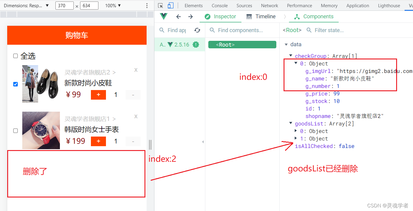 通过button的点击将对应的索引值(index)进行传过去,通过splice函数方法伤处掉goodsList中的商品数据,这个操作没有问题,但是删除的同时是需要删除对应在checkGroup中的商品数据,此时是不能够通过索引(index)的方式删除的;