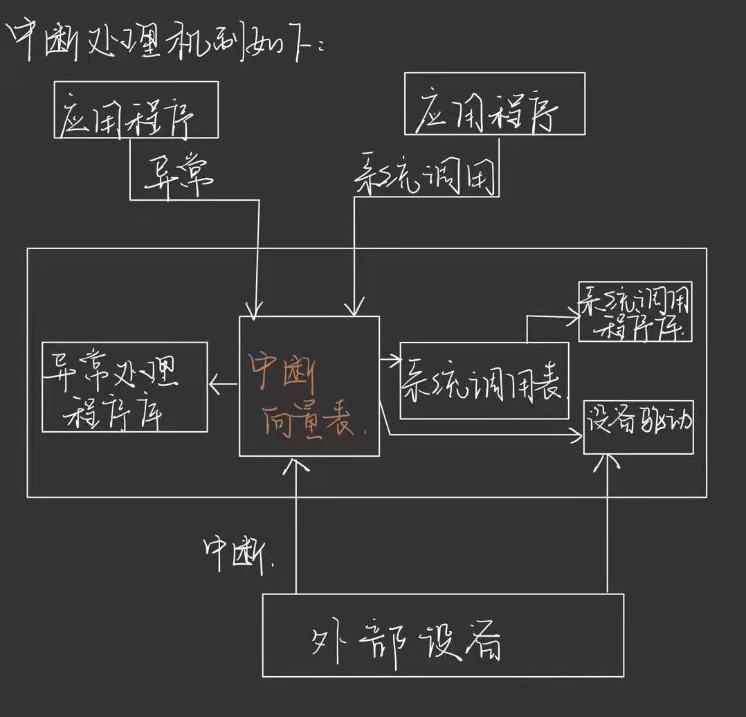 1.发生中断时,根据中断向量号查询中断向量表,根据里面的处理程序,协调设备驱动处理外部设备的中断请求