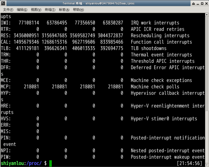 通过/proc/interrupts可以查看当前运行中的中断信息,但是如果中断退出后要查看它的历史使用情况怎么办呢?这里可以通过/proc/stat来查看,用cat会看到它有很多行输出,这里我们关注一下intr行