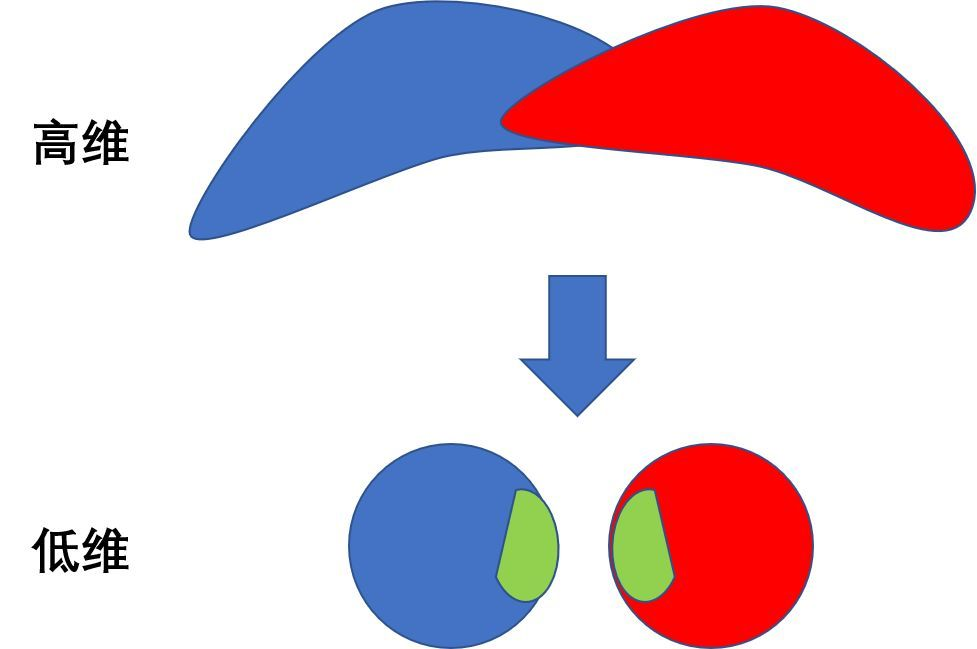 如图(来自网络)所示,其中两个黑色的圈之间的距离,可能直接连接的很近,如果上升到流形的理论,其连接距离就不再是直线连接,而是流形表结构上的距离。然后,我们再看下这个拓扑算法,通俗讲就是只考虑物体间的位置关系而不考虑它们的形状和大小。那么,怎么把这两者结合起来构成我们的UMAP呢,其实很简单,就是基于高维的流形结构特征,将其中各个点之间的位置关系进行确定,从而构造高维的数据分布结构。然后在使其降维到低维的分布结构,从而达到聚类以及特征提取的效果,可以用图来表示: