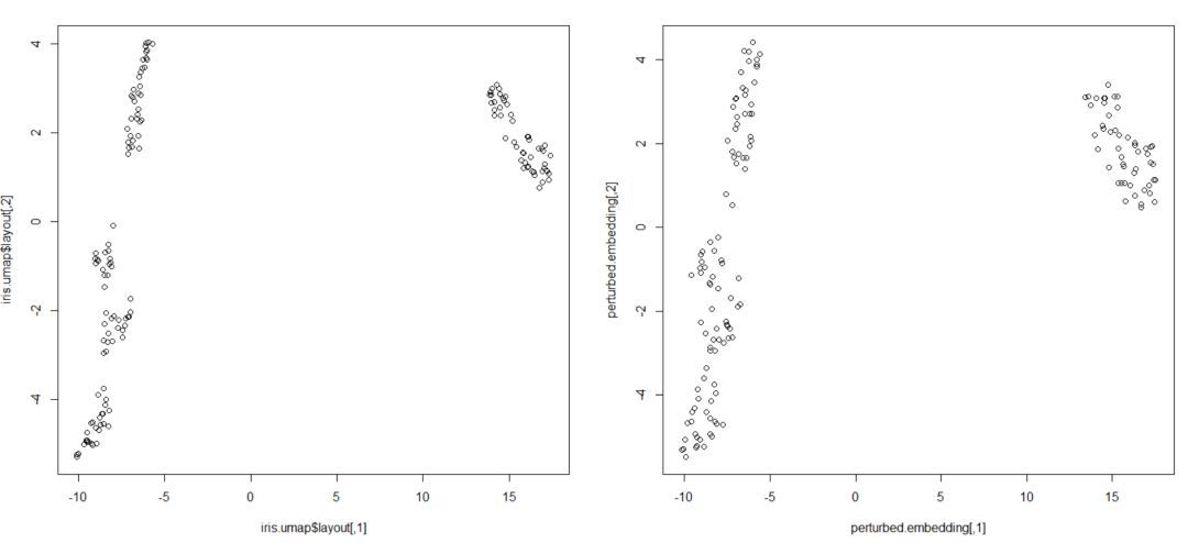 # create a dataset with structure likeiris, but with perturbation iris.perturbed = iris[,1:4] +matrix(rnorm(nrow(iris)*4, 0, 0.1), ncol=4) # project perturbed dataset perturbed.embedding = predict(iris.umap,iris.perturbed) par(mfrow=c(1,2)) # output is a matrix with embeddingcoordinates plot(iris.umap$layout) plot(perturbed.embedding)