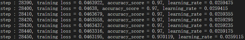 print("step : %d, training loss = %g, accuracy_score = %g, learning_rate = %g" % (i, training_loss[1], metrics.accuracy_score(gr_label, result), training_loss[2]))