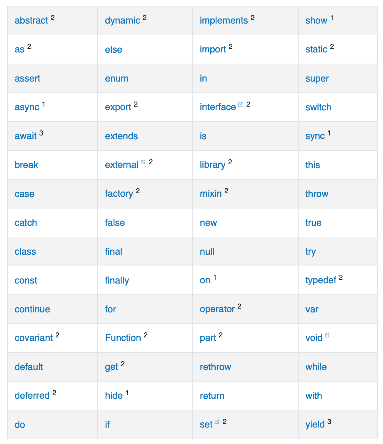 - 角标为3的是较新的关键字,这些关键字在Dart 1.0之后用于支持异步,当一个函数被标记为async或async或sync时,你不能使用await或者yield作为变量名