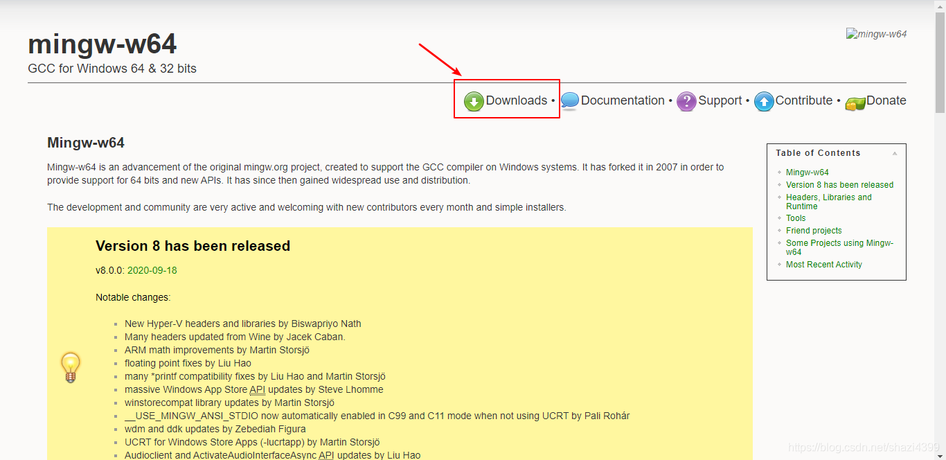 1、进入 MinGW-w64 官网首页(http://mingw-w64.org/),点击 Downloads 进入下载页面