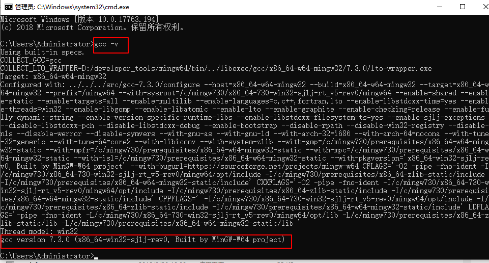 6、输入 gcc -v用于获取gcc的版本号,如果能成功显示下图所示,则说明MinGW -w64 安装成功了