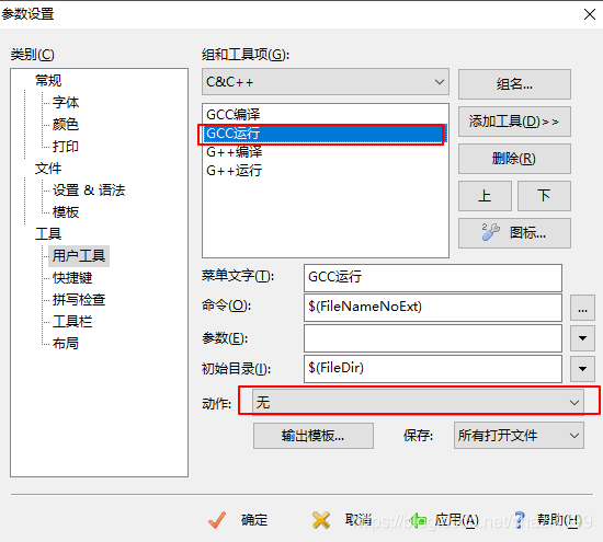 4、依次添加 「 gcc 编译」「 gcc 运行」「 g++ 编译」「 g++ 运行 」命令