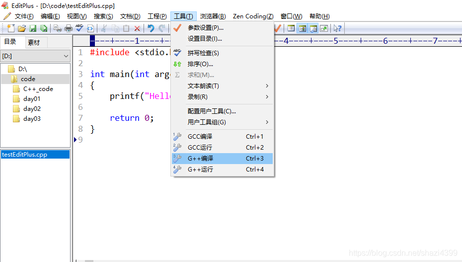 7、点击「工具」,选择 「G++ 编译」 选项。或者用 Ctrl + 3 快捷键操作。