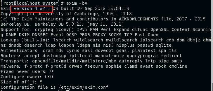 由于Exim低于4.92.1版本均受影响,所以可以由人工查看Exim版本的方式对漏洞进行检查。使用命令“exim -bV”即可查看到当前exim版本,如果我们当前的版本在受影响列表中,即可确定存在漏洞。如下图: