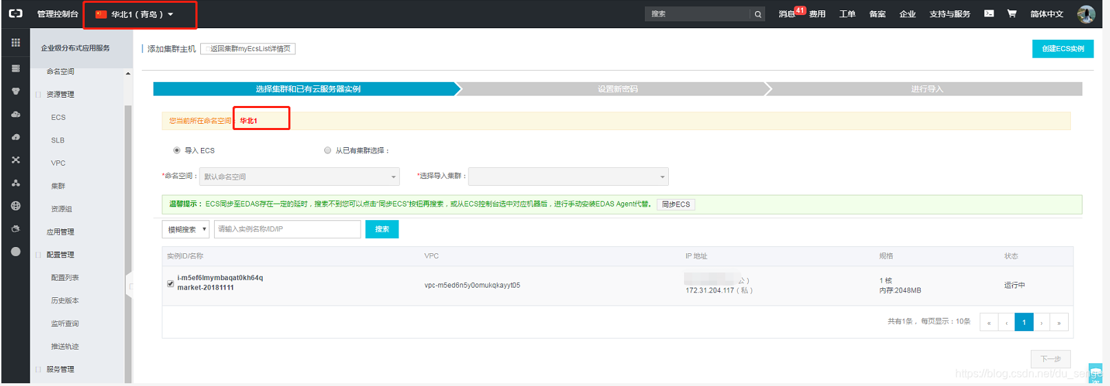 注意当前选择的命名空间一定要跟购买的ECS实例在同一个区域,否则列表中为空无法显示出来