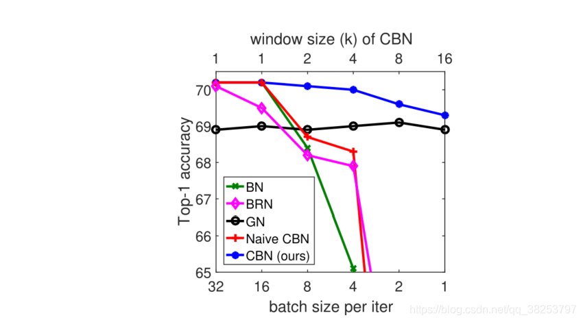 BN有一个致命的缺陷,那就是我们在设计BN的时候有一个前提条件就是当batch_size足够大的时候,用mini-batch算出的BN参数(μ和σ )来近似等于整个数据集的BN参数。但是当batch_size较小的时候,BN的效果会很差。如下图的BN线,随着batch_size的减小,BN的表现骤减。