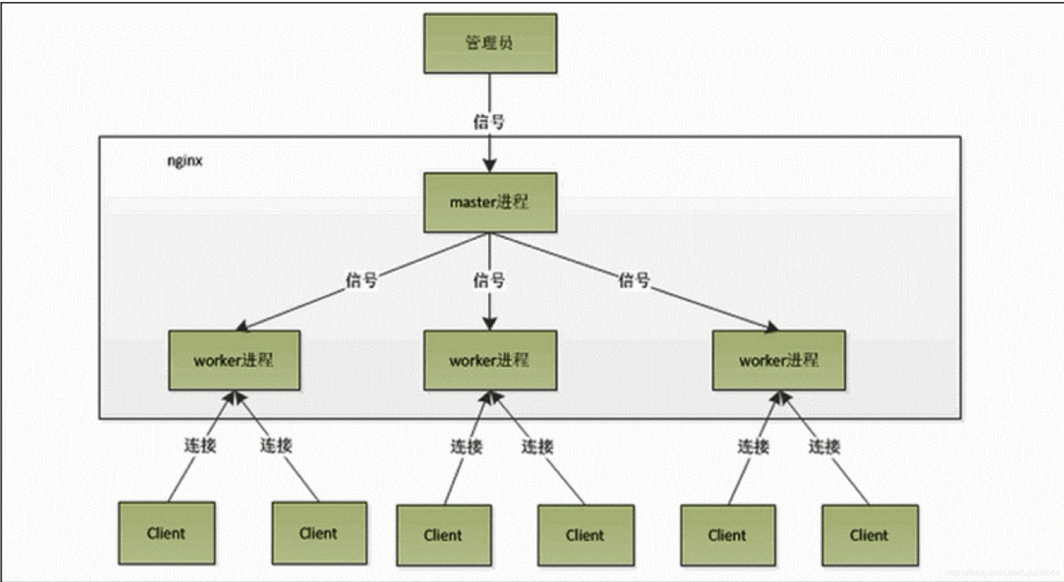 Nginx在启动后,会有一个master进程和多个worker进程。master进程主要用来管理worker进程,包含:接收来自外界的信号,向各worker进程发送信号,监控 worker进程的运行状态,当worker进程退出后(异常情况下),会自动重新启动新的worker进程。
