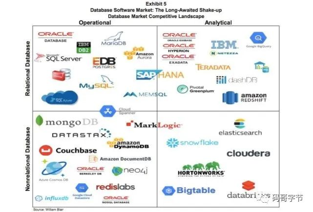 Willian Blair 在《Database Software Market:The Long-Awaited Shake-up》一文中以以下维度为数据库系统做了一个细致的分类:关系型/非关系型、操作型/分析型。