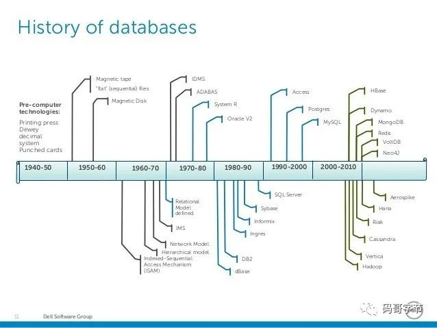 1970 年,大神 EF Codd 发表了一篇重要的论文:《????大型共享数据库的数据关系模型》,提出了使用关系数据库模型的建议,他的想法改变了人们对数据库的看法。在他的模型中,数据库的架构或逻辑组织与物理信息存储断开连接,这成为数据库系统的标准原理。之后 UBC 开发了 Ingres 和在 IBM 开发了 SystemR。Ingres 使用一种称为 QUEL 的查询语言,引导而诞生了 Ingres Corp,MS SQL Server,Sybase,PACE 和 Britton-Lee 之类的系统。另一方面,System R 使用 SEQUEL 查询语言,它有助于 SQL / DS,DB2,Allbase,Oracle 和 Non-Stop SQL 的开发。关系数据库管理系统(RDBMS)已经成为公认的术语。