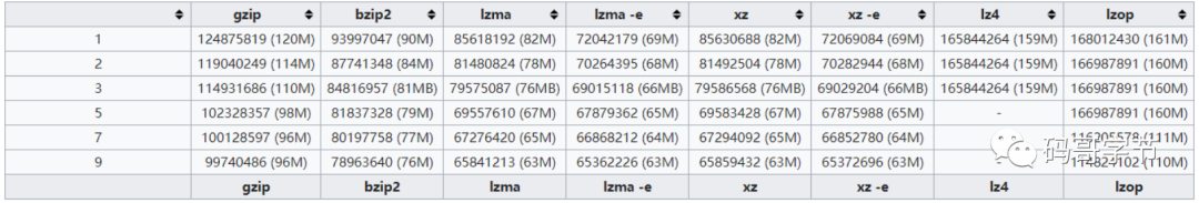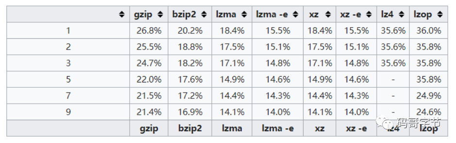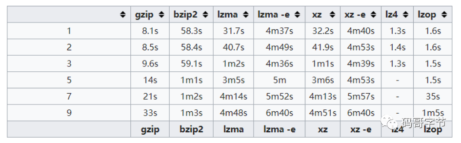 下面列举一些常见的压缩算法或方法(Gzip、Bzip2、LZMA、XZ、LZ4、LZO),并做相应的对比: