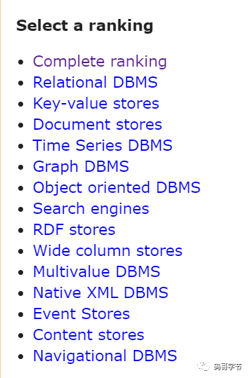 迄今为止,业界诞生的数据系统数不胜数。如果你打开????DB-Engines 网站,可以看到几百个功能定位不同的数据库系统。查看DB-Engines的分类排名,可以看出DB-Engines将如此众多的系统大致分为以下几类(????网址):