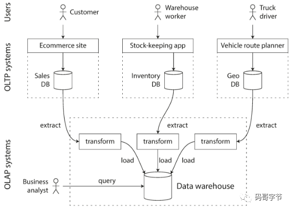 分析和事务是两个世界。在分析需求不大的时候,很多团队直接使用业务事务数据库做分析使用,这只能支持小数据量、分析需求变化不大,弱分析的场景。真正的数据分析场景,往往使用单独的数据仓库。在不影响业务库的情况下,实时或周期批量地从中提取数据,转换成对分析友好的数据模式,执行必要的清理和转换,然后加载到数据仓库中。将数据导入仓库的过程称为提取-转换-加载(Extract-Transform-Load, ETL)。
