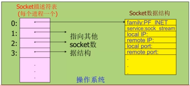 当应用进程创建套接字时,操作系统分配一个数据结构存储该套接字相关信息(双方的那四个信息以及该socket本身的名字),返回套接字描述符。
