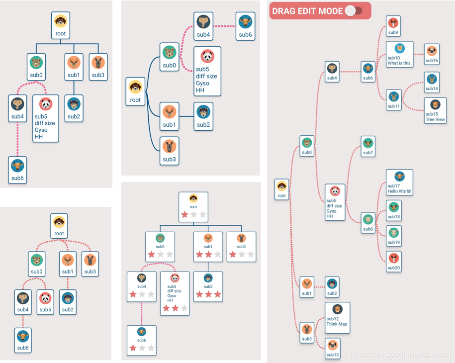 目前没发现比较好的Android树状图开源控件,于是决定自己写一个开源控件,对比了一下市面上关于思维导图或者树状图显示(如xMind,mind master等)的app,本文开源框架并不逊色。实现这个树状图过程中主要综合应用了很多自定义控件关键知识点,比如自定义ViewGroup的步骤、触摸事件的处理、动画使用、Scroller及惯性滑动、ViewDragHelper的使用等等。主要实现了下面几个功能点。