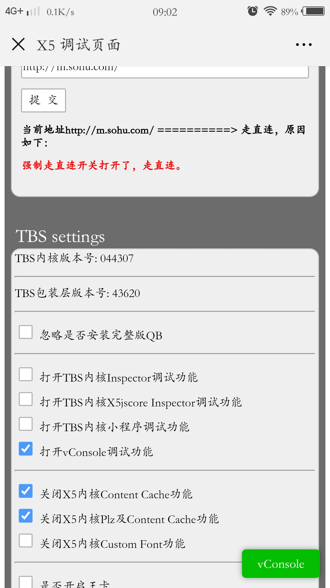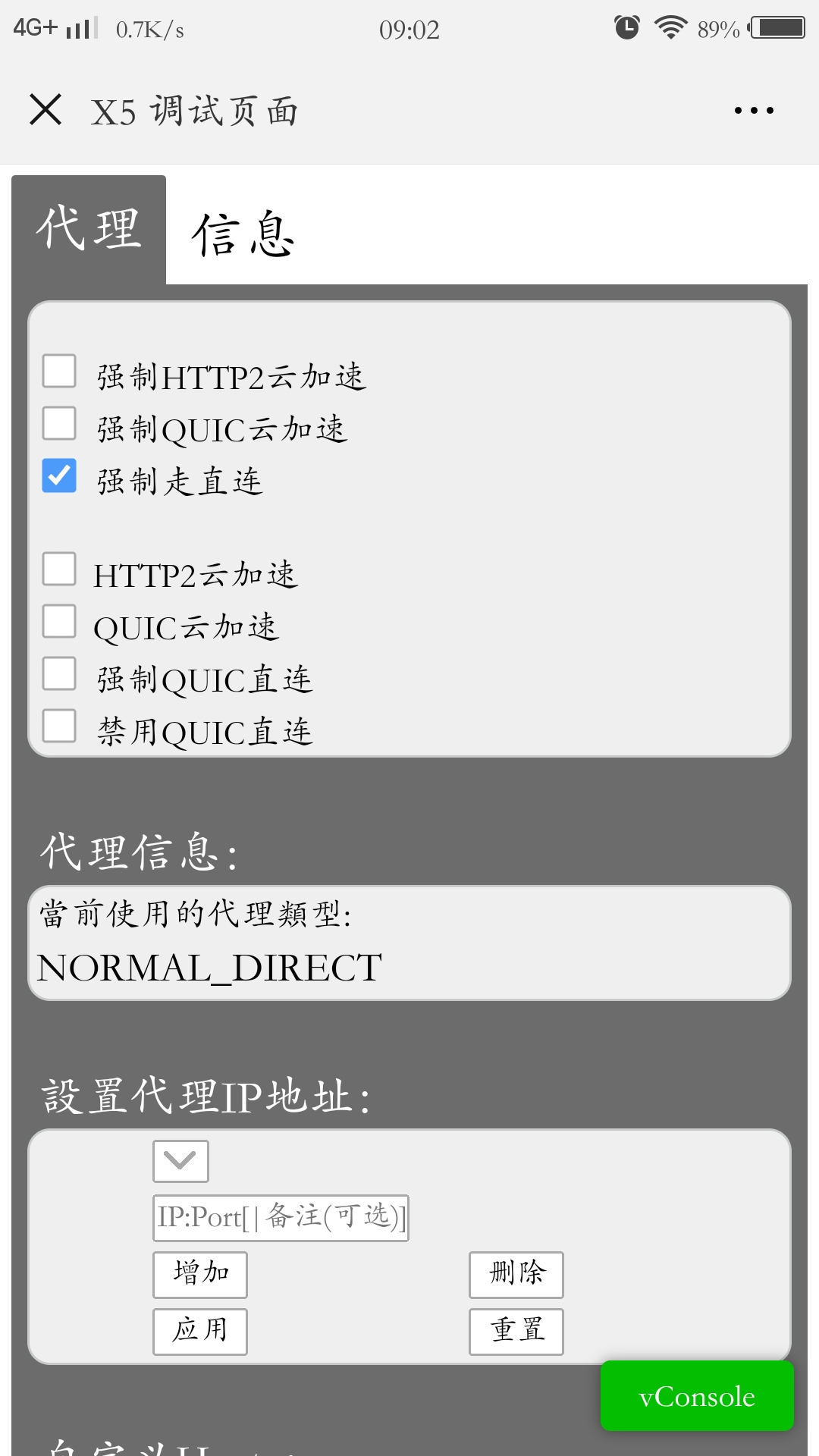 微信H5调试以及样式错乱问题解决一、扫下方二维码:二维码链接: http://debugx5.qq.com/二、勾选 代理 -> 强制走直连三、 具体操作如下:提交域名,输入测试域名,点击提交;打开vConsole调试功能;关闭缓存。版权声明:本文为qq_26245325原创文章,遵循CC 4.0 BY-SA版权协议,转载请附上原文出处链接和本声明。原文链接:https://blog.csdn.net/qq_26245325/article/details/84578503