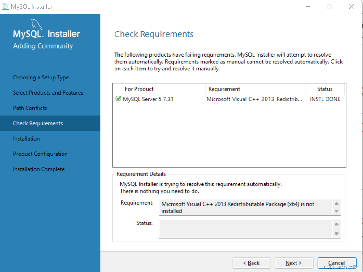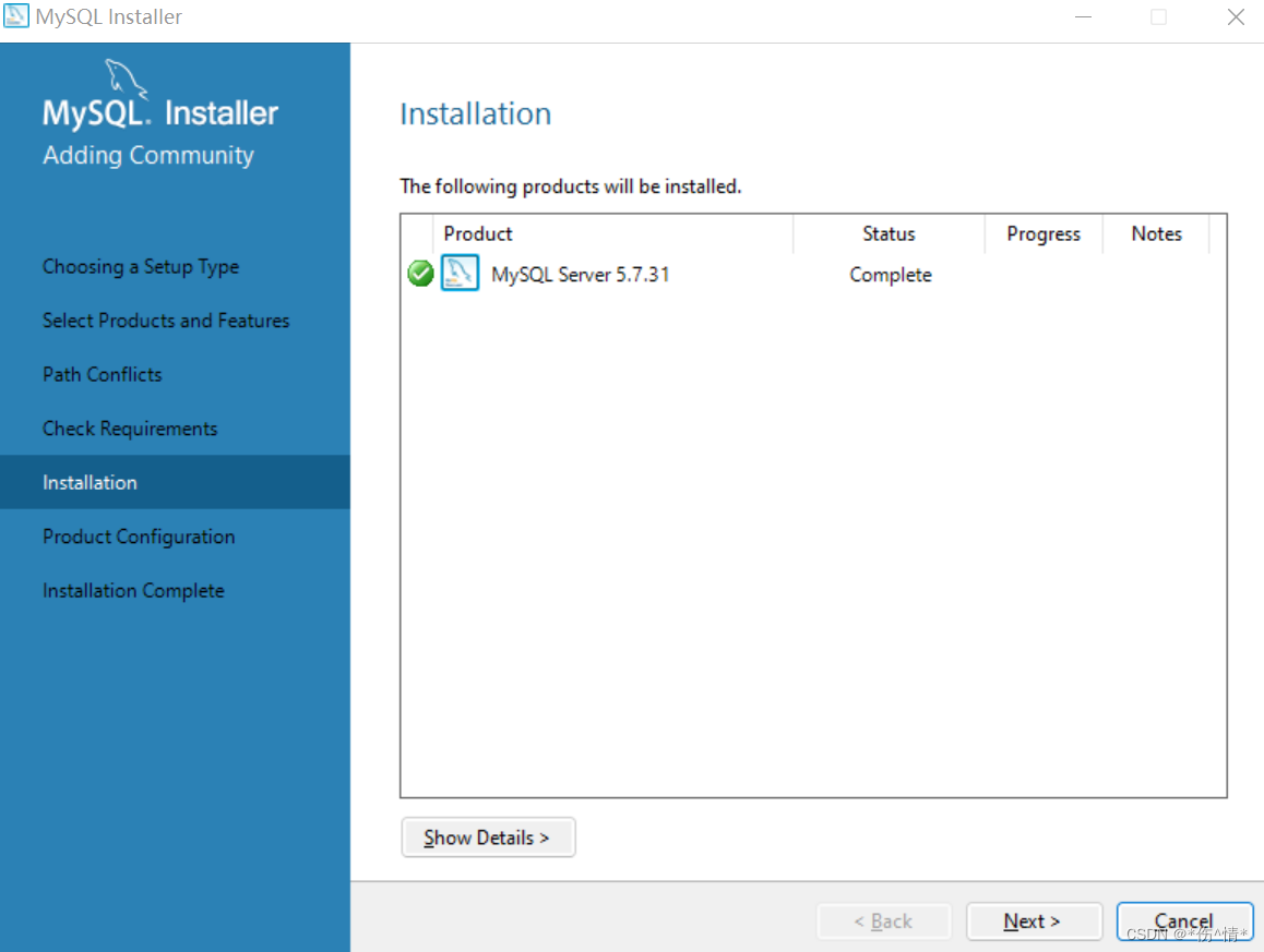 看到MySQL Server 5.7.31前面被绿色勾选说明环境已经装好,点击Next