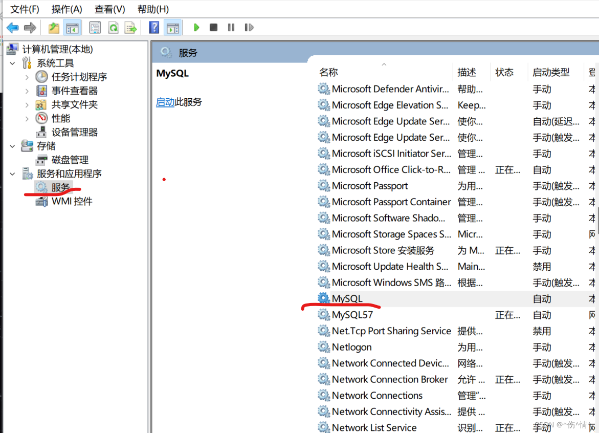 mysqld -install安装好后,在计算机管理中 双击MSYQL,启动类型选择自动,点击启动按钮即可。