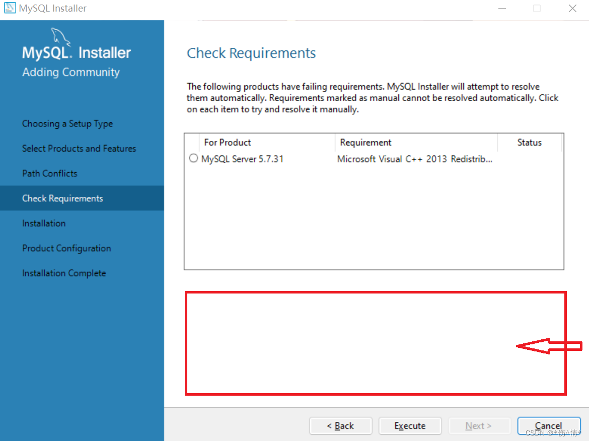 选中MsSQL Server 5.7.31,如果没有安装会在红色区域提示安装“Microsoft Visual C++ 2013”环境,点击Execute