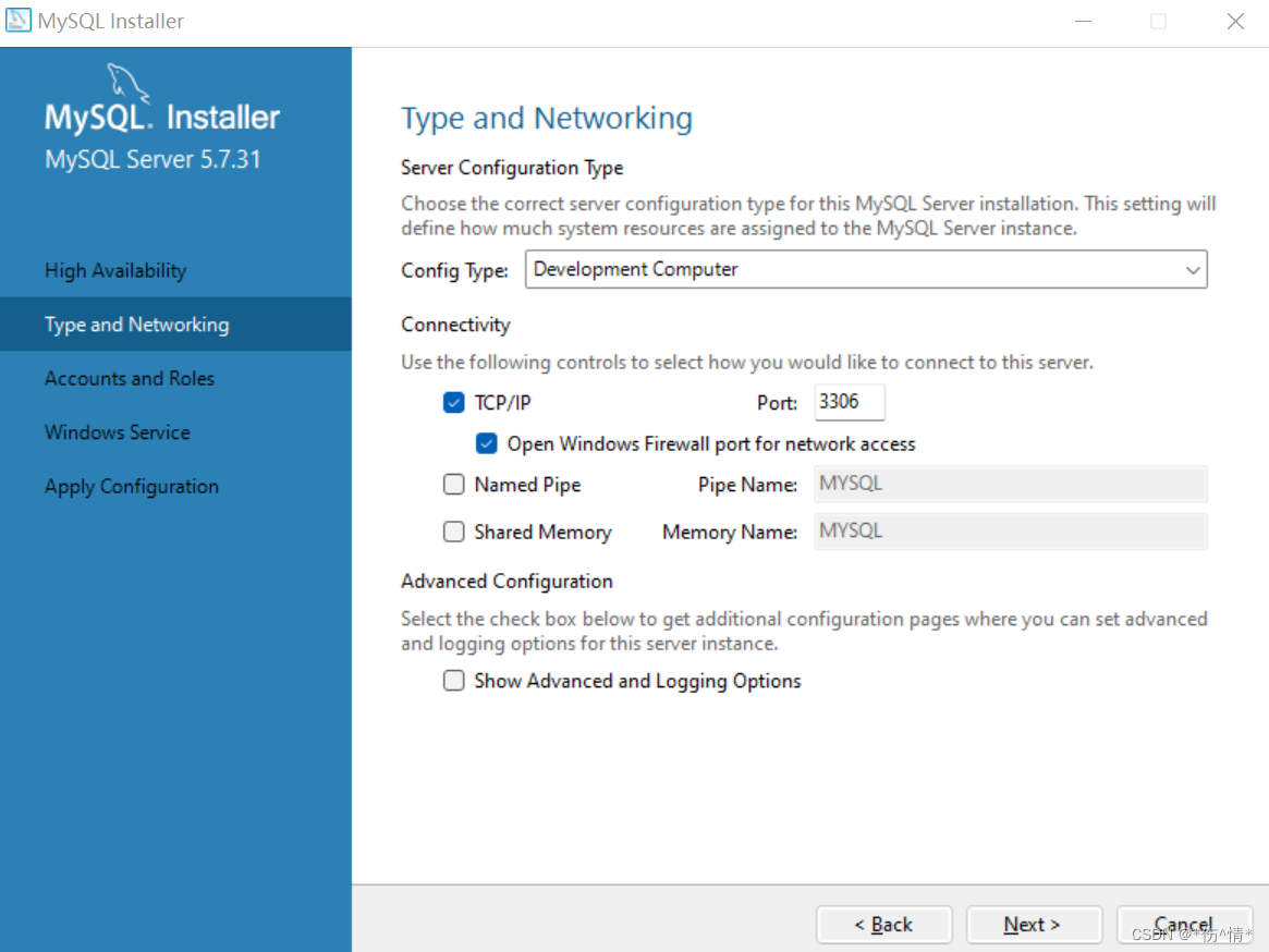 一直点击Next,知道下面如图为止,Config Type选择Development Computer(开发计算机)这个适合个人使用,端口3306不需要修改,点击Next