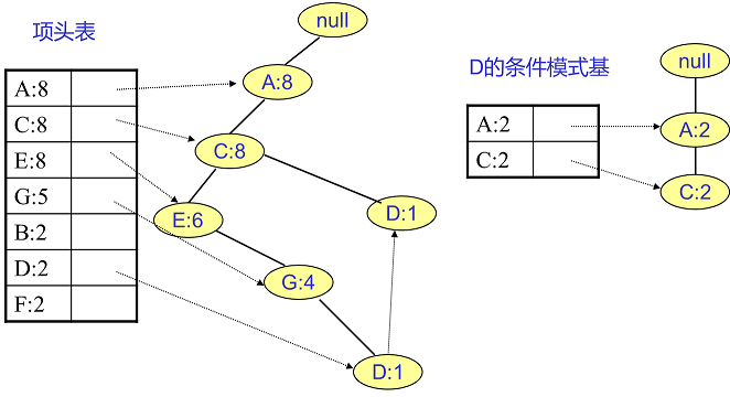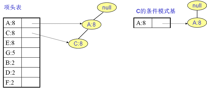 C的条件模式基如下图右边,递归挖掘到C的最大频繁项集为频繁2项集{A:8, C:8}。