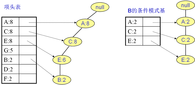 同样的方法可以得到B的条件模式基如下图右边,递归挖掘到B的最大频繁项集为频繁4项集{A:2, C:2, E:2,B:2}。