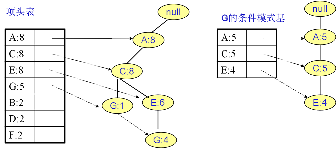 继续挖掘G的频繁项集,挖掘到的G的条件模式基如下图右边,递归挖掘到G的最大频繁项集为频繁4项集{A:5, C:5, E:4,G:4}。