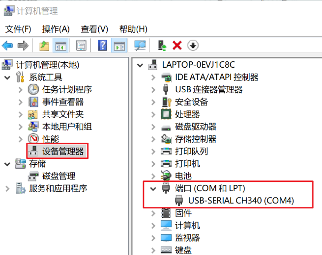 (4)点击设备管理器,点击端口,如出现如下图中的CH340(COM3或COM4等)即安装驱动成功。