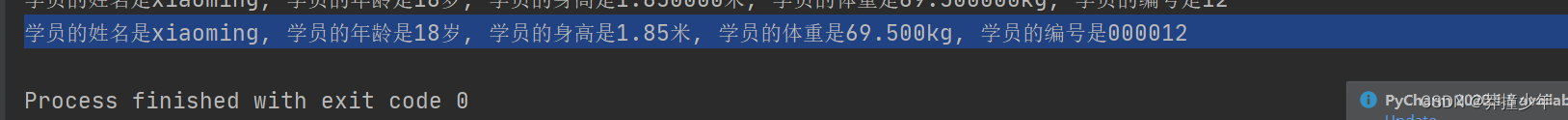 print('学员的姓名是%s, 学员的年龄是%d岁, 学员的身高是%f米, 学员的体重是%fkg, 学员的编号是%d' % (name, age, height, weight, id))
